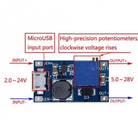 This DC to DC boost converter module is designed with a Micro USB input and has adjustable output voltage functionality. Using the multi-turn potentiometer on the board, the user can fine-tune the output voltage. It is suitable for various electronic and industrial projects that require voltage step-up.