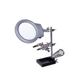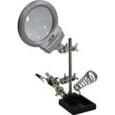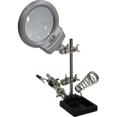Mounting bracket with magnifying glass magnifyinggrippers spiral on the soldering iron tip for a cleanerand LED backlight.